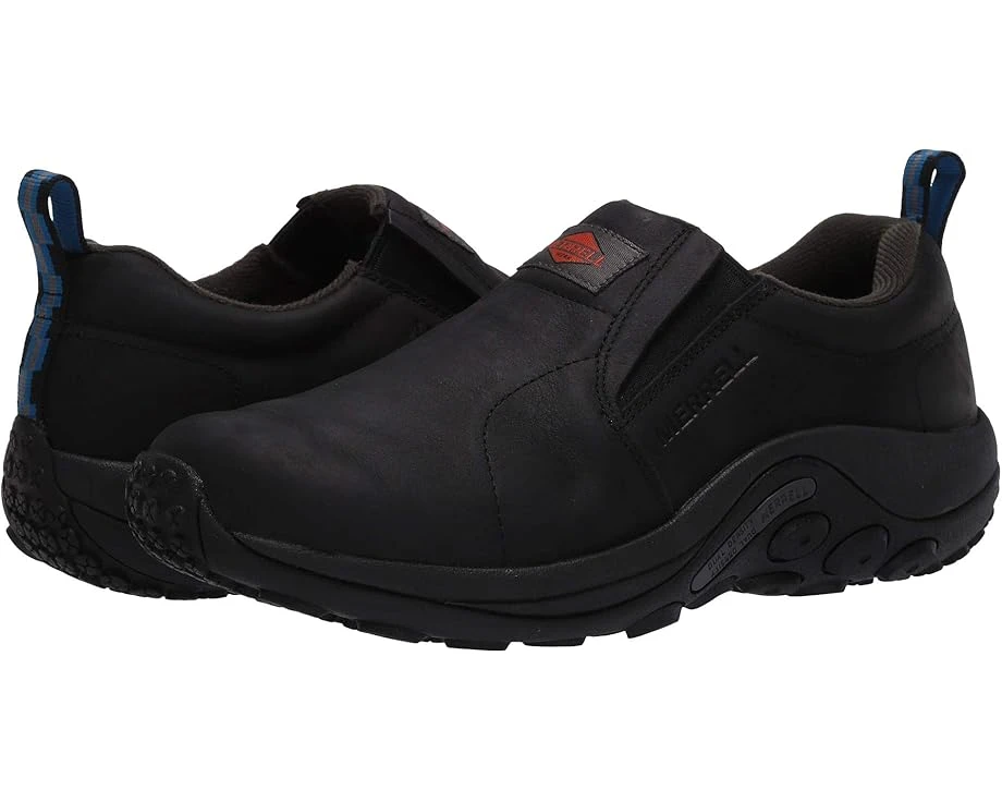 The Merrell® Work Jungle Moc Leather Slip Resistant slip-on work shoes combines a durable, full grain leather upper, superior underfoot comfort, and reliable slip resistance to give you total confidence all workday long. SKU: #9389521Part of the Merrell Work Collection.Style numbers: J099321/J099321W-001 (Black) and J099323/J099323W-201 (Espresso). Slip-on, non-safety toe work shoe that meets ASTM F2892-11 EH (Electrical Hazard) safety standards.Protective, abrasion-resistant rubber toe cap. Heel pull tab. Padded mesh collar for added comfort. Breathable mesh lining offers a great in-shoe feel. COMFORTBASE™ contoured design footbed with breathable foam cradles your foot in all-day comfort.Air cushioning in the heel absorbs impacting shock and adds stability. COMFORTBASE™ rubberized EVA midsole provides superior support, cushioning, and shock absorption.Molded nylon arch shank supplies flexible support. Outsole is oil and slip resistant and is Mark II tested. M Select™ GRIP rubber outsole with 3mm lug depth offers excellent traction and grip on various surfaces. Heat-resistant outsole provides protection for brief periods of direct contact with temperatures that meet or exceed 500°F.Imported. Product measurements were taken using size 10, width M. Please note that measurements may vary by size.Weight of footwear is based on a single item, not a pair.Measurements: